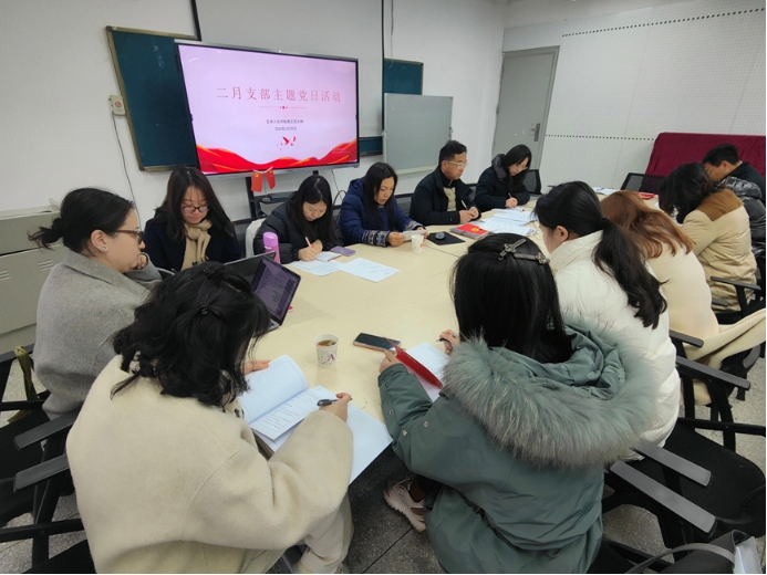2024年2月29日,艺术人文学院教工党支部开展2024年2月主题党日集体学习,会议由教工党支部书记辛宇主持。在正式学习开始之前,全体党员集体诵读党章、重温入党誓词、缴纳党费。辛宇同志...