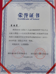 论文《武汉工人业余版画创作与社会主义新人塑造——以武汉美术馆藏工业版画作品展为例》获湖北省文艺作品推优活动(2022-2023年度)展览艺术类一等奖。