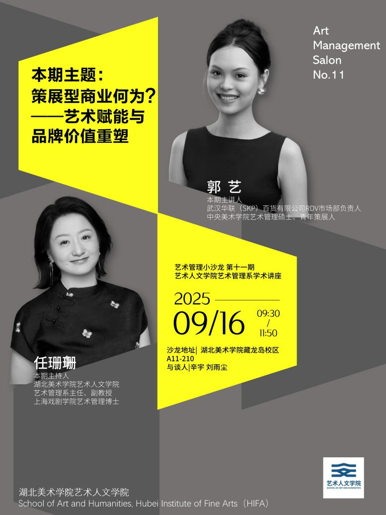 2025年9月16日上午9:30,艺术人文学院艺管小沙龙第十一期在A11-210教室顺利举办。武汉华联(SKP)百货有限公司RDV市场部负责人、中央美术学院艺术管理硕士、青年策展人郭艺受邀开展分享。本次讲座主题为“策展型商业何为?——艺术赋能与品牌价值重塑”,探讨策展型商业的发展逻辑、实践路径以及面临的挑战与未来趋势。艺术人文学院艺术管理系主任任珊珊副教授主持,艺术人文学院夏梓副教授、文化产业管理教研室主任辛宇博士、教师刘雨尘博士、青年教师杨光、彭叶怡及相关专业师生参与交流。