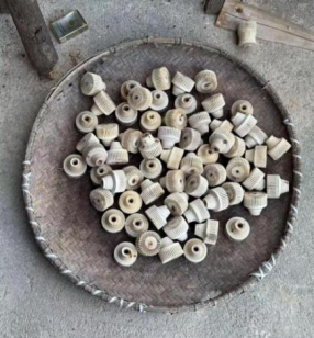 而后去到附近一位年迈的老人莫尚德家中,莫尚德师傅由于年龄较大,已经不能完全适应科学技术快节奏的发展,但其仍然坚持油纸伞手工艺的制作,他们向我们展示了祖上传下来的制作油纸伞零部件的设备以及使用该设备制作出来的伞葫芦等零部件。(图2-3)