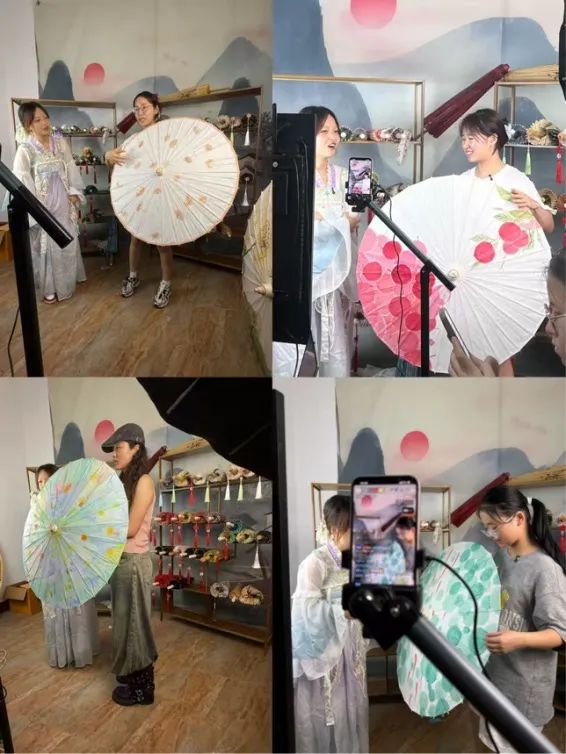 长沙学院的师生于宇昌伞业有限公司内在先前的多次考察过程中已经有了一定时间的直播经验,与公司已经达成了多次的合作,直播反响卓越。于是热情邀请湖北美术学院的同学们共同参与到他们的新媒体直播间中。在精心布置的直播间里,湖北美术学院的四位同学刘阳、黄书怡、吴远湘、陈雨欣同学自信地走到镜头前,向直播间的观众生动展示了自己在考察期间的伞面创作,分享了此次暑期考察的丰硕成果(图4-1)。他们的介绍充满热情与专业见解,直播间互动踊跃,有效拉近了传统工艺与年轻受众的距离。