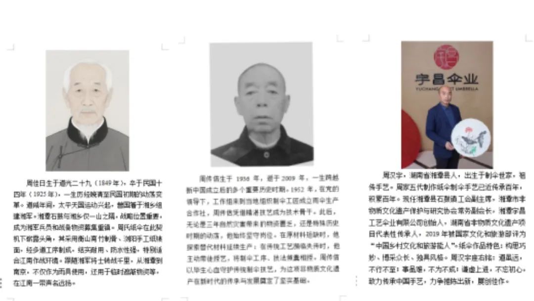 为精准响应国家级非遗传承人周汉宇先生确立家族油纸伞技艺传承历史与自身法定传承人身份的核心诉求,团队成员戴文兴深度挖掘周氏家族谱系脉络,紧密结合石鼓地域文化特色与周氏家族特点,精心设计并完成了“非遗油纸伞传承谱系展板”。该展板通过严谨的谱系梳理与创新的视觉呈现,清晰展示了周氏家族世代守护与精进石鼓油纸伞技艺的传承历程,为周汉宇先生的传承人身份及其所代表的深厚文化根脉提供了直观、权威的认证依据成为工作站不可或缺的文化基石。