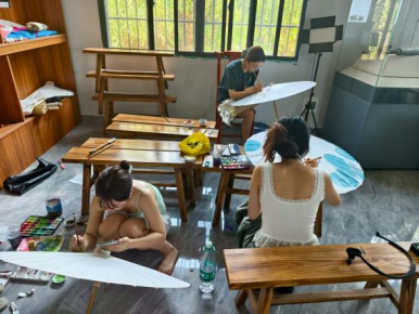 在完成油纸伞课程的实践后,团队成员与工厂内的工匠进行了工艺上的交流,尝试动手实践学习(图1-6)(图1-7)。并将自己通过打印或者现场制作的设计图案进行展示,最终取得了大量的艺术成果,同时收到了石鼓镇党委书记徐彬的邀请,前往韶山市“湖南红色旅游文化节暨湘潭市第四届旅游发展大会”将以上的艺术成果进行展览。