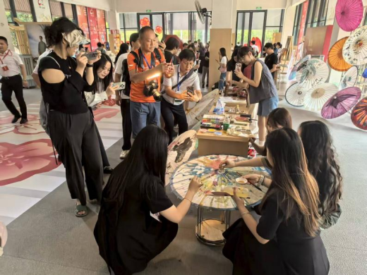 展览于7月11日正式启动,展览上午莅临了省级、市级等各位领导,无不对团队展示的内容表示称赞与认可,甚至希望继续交流协谈商贸。(图6-3)在展览现场,为了让欣赏的人们不仅可以观看到精美的纸伞装饰,同时设立了2个体验实践的展台,让观众能够切身加入其中,欣赏艺术的同时感受艺术,让非遗艺术成为大众的艺术。(图6-4)第一展台技艺聚焦伞面绘画的创新表达,由团队成员黄书怡、刘阳、陈雨欣等以传统油纸为画布,融入现代审美意象,演绎地域文化符号,绘制传统与现代多种装饰图式,既保留着古法绘画的细腻笔触,又洋溢着鲜活的时代气息,让观众直观感受到传统伞画在当代的多样可能。(图6-5)第二展台展示伞面拓印技艺,由吴远湘与曾倩梓同学等通过施墨、按压等方式拓印,让观众得以窥见这项古老技法中的“复刻之美”。(图6-6)