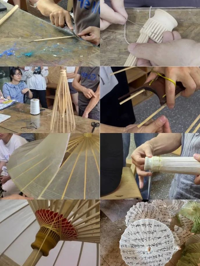 在充分了解与学习油纸伞的文化与历史发展后,团队在导师的带领下,立即参与了《油纸伞制作与装饰》中传统非遗油纸伞的制作流程,亲身体验非遗传统手工艺的制作与实践,课程内容包括以下几个内容: