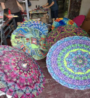 最后是衡阳南岳油纸伞工艺创新,首先在生产模式创新上,降本增效的产业链协作。南岳区工厂通过毛坯房集约化布局显著降低场地成本,并形成灵活的生产线置换机制。当地企业以布企生产为主,油纸伞因市场需求萎缩仅接受预订定制。为应对同质化竞争,工厂采取差异化策略,其一通过产业链分工,部分厂商专攻素伞生产(图2-5),为下游企业提供半成品,支持二次创作;其二通过轻资产运营省略精装修、共享基础设施,实现快速产能调整。其次是伞面设计创新,文化融合驱动市场突围。面对布伞“薄利多销”导致的利润压缩与国货风险,企业通过文化嫁接突破困局,荣欣伞业等头部厂商引入美国街头涂鸦、塔罗符号、动漫IP等元素,替代传统山水花鸟。依托外贸渠道,以“中西融合”设计打开国际市场,规避低价内卷。(图2-6)