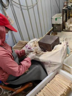 随后与左师傅共同前往湘潭虞塘镇,会见专门利用传统竹制材料对短伞骨进行加工的油纸伞产业负责人王国湘,其同样是在传统技艺的继承下,与左师傅相同,开展出了一条机械化生产传统油纸伞的道路。其采用半机械化生产模式,首先依托机器将竹子材料分成长约9.5CM、短约2CM的短鼓模型,将模型的两个侧边分别刺出17个小孔,宽部两侧磨成半弧形,再将短鼓模型分成4个平均的部分,最后依托人工对其进行打磨。(图2-2)