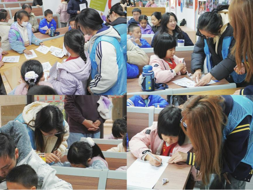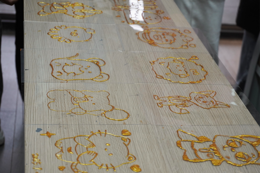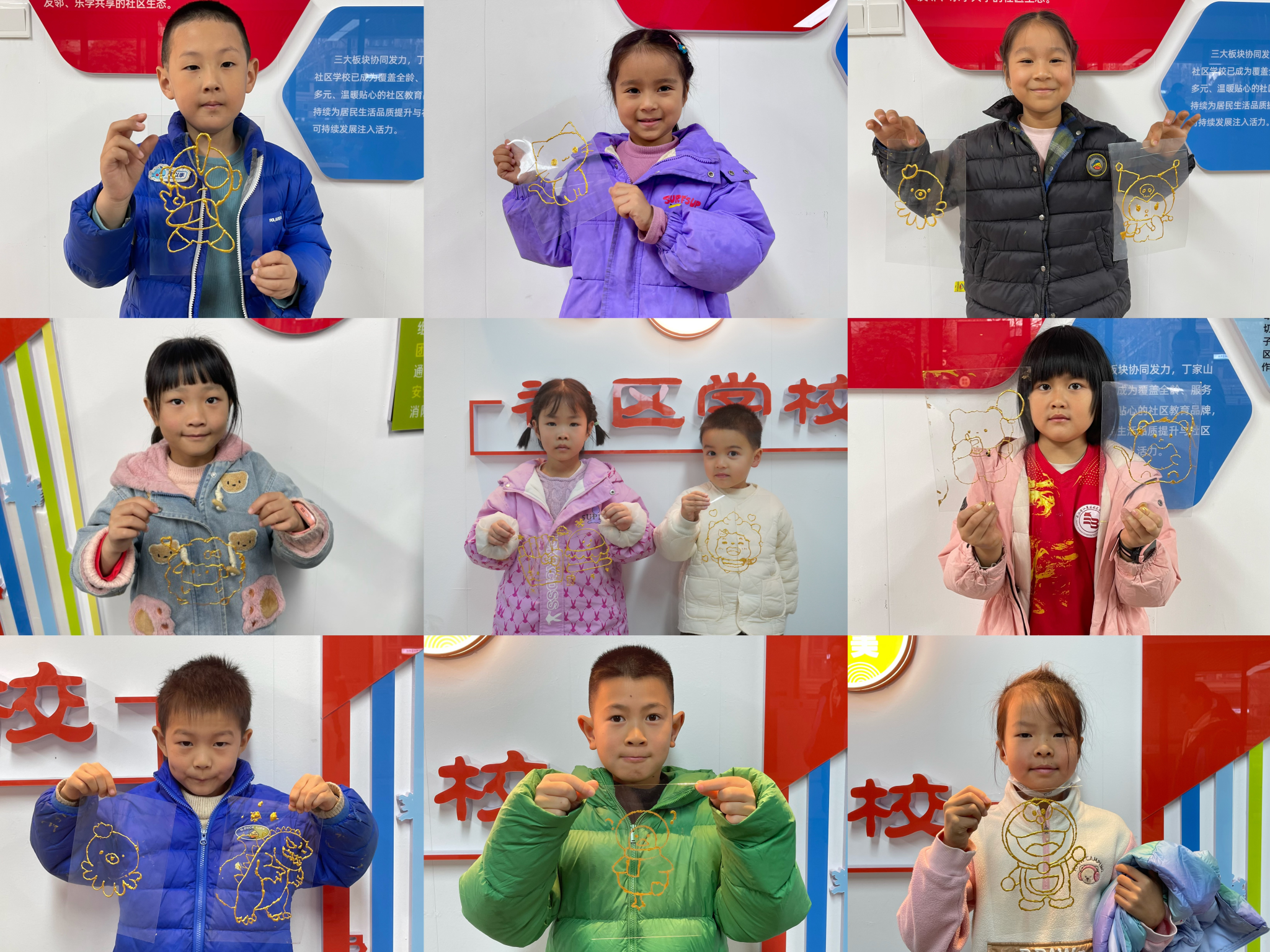 实践环节,志愿者分步骤演示了“金线糖画”的制作流程:固定底稿、铺覆PVC板、沿图样以金线膏细致勾勒,并重点讲授“手稳、心细、速度匀”的操作要领。小朋友们在认真观摩后,在志愿者的指导下亲自尝试挤压金线膏,沿着图案缓缓描摹。随着小动物、雪花及卡通形象等纹样逐渐成形,一幅幅闪耀金色光泽的“糖画”跃然呈现。活动现场温馨而专注,孩子们互相展示作品、交流心得,在互动中收获创作的喜悦与成就感。
