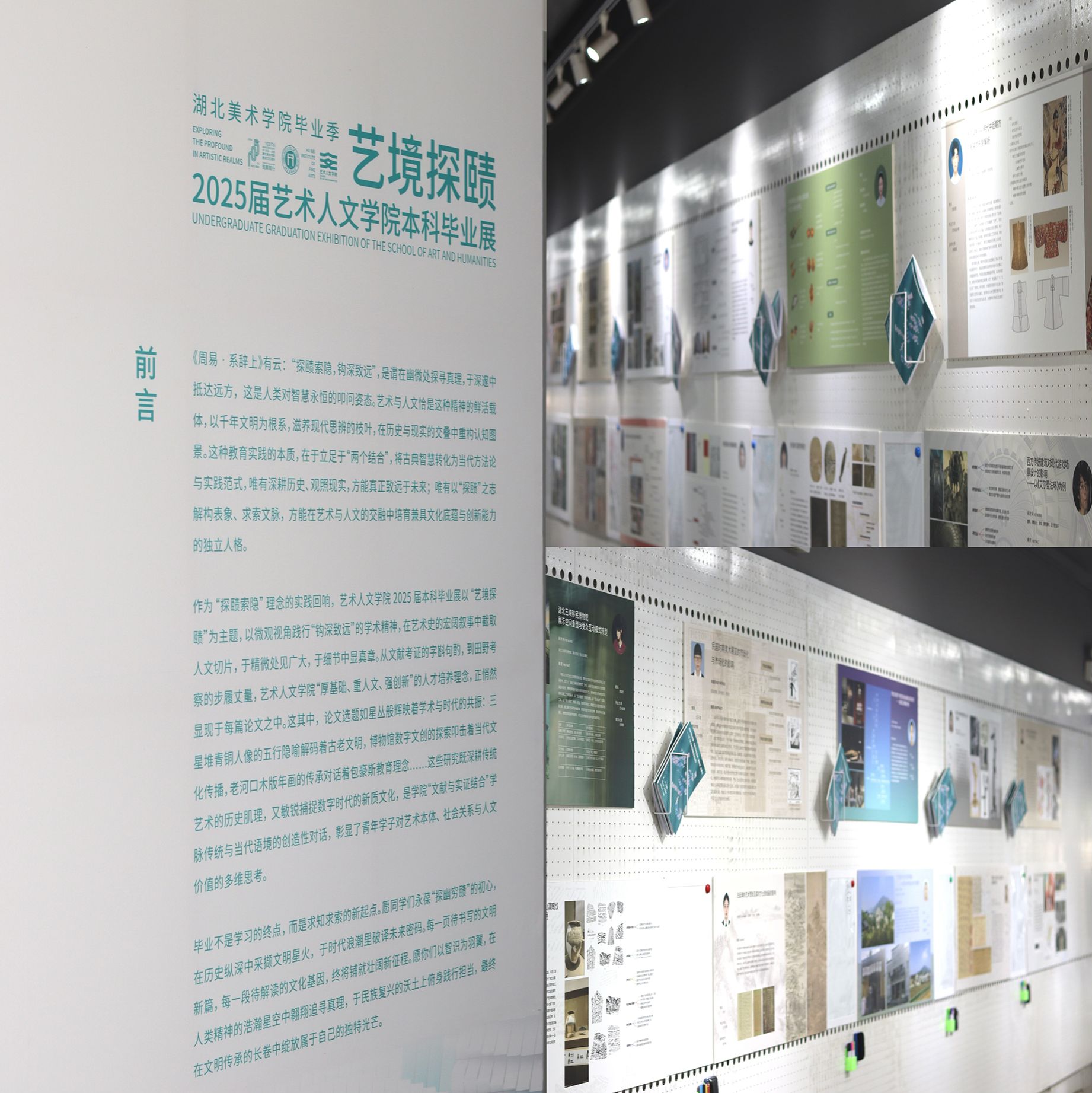本届毕业展以“艺境探赜”为主题,展出了艺术人文学院各专业方向本科生毕业论文,涵盖艺术史论、艺术管理、艺术设计、艺术教育专业。作品延续了学院“厚基础、强实践、重创新”的育人理念,彰显了青年学子对艺术本体、社会关系与人文价值的多维思考。