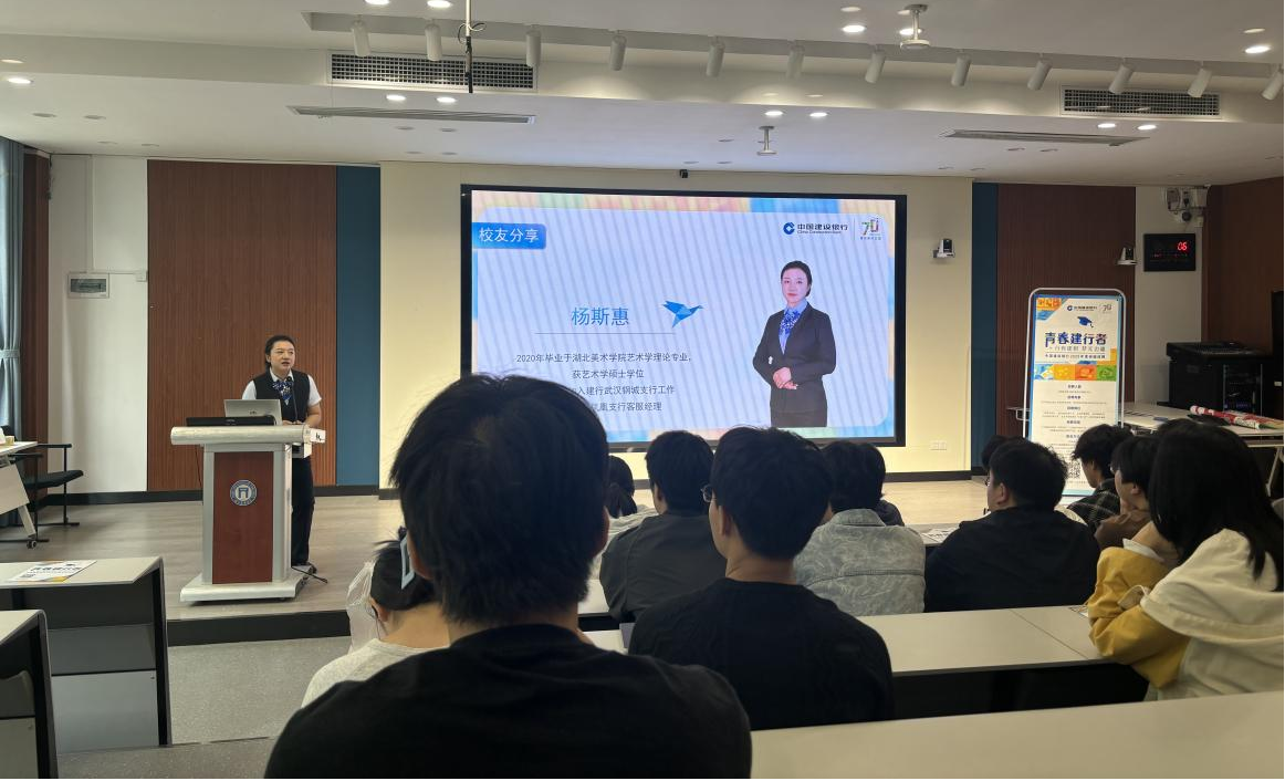 宣讲会上,艺术人文学院2020届毕业生,现中国建设银行武汉凤凰支行客服经理杨斯惠,与同学们分享了建行备考经验,鼓励同学们坚持追求个人的学业目标和树立职业生涯规划,怀揣着属于自己的梦想与追求,书写属于精彩人生篇章。