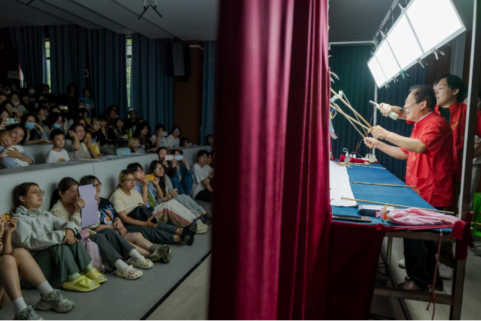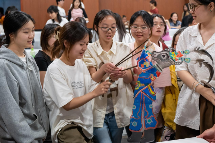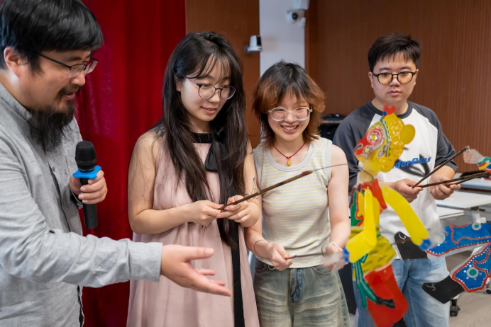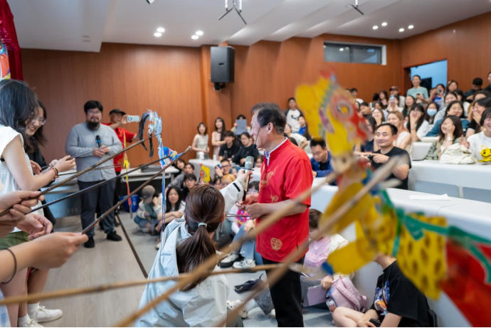 互动环节,耿纪朋教授引导在场学生分批次体验操控皮影人走位、翻转、打斗、配乐、拟声等基本功,让同学们现场感受传统文化的独特魅力,在他们心中播下诚信友爱、智慧善良、坚韧勇敢的种子。