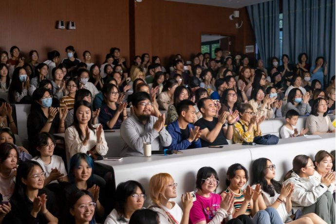 表演余尾,满头大汗的秦礼刚拿着正反角色的两个皮影人从幕后走向幕前,结合自身成长与演出经历向师生介绍了国家级非遗项目云梦皮影戏剧的文化魅力,以及在皮影传承创新和对外文化交流方面作出的努力,道出了他人生在戏里,戏里有人生的真切体悟。他勉励青年大学生们,要坚定文化自信,勇敢站出来,自觉坚守住祖辈们留下来的技艺绝活,做时代迭变与代际转型中连接传统之美的新生代,让皮影戏焕发新生机。
