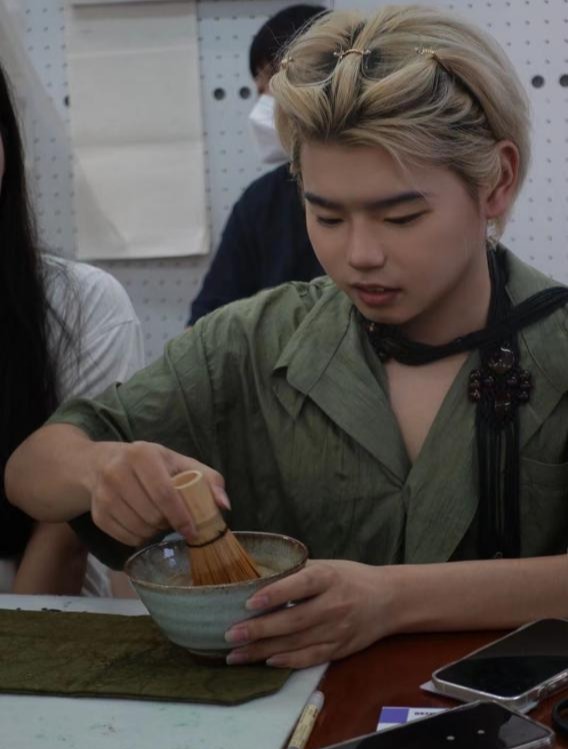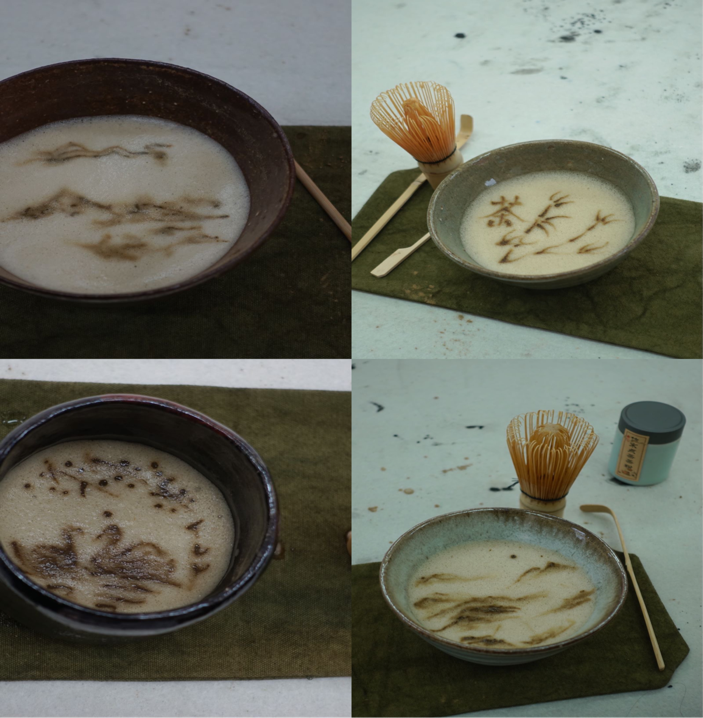 活动伊始,龙老师向同学们现场演示了如何点茶。随后,由同学们按照老师的演示开始进行实操。在茶盏中注热水,并将茶筅泡软。舀三勺茶粉,并注入热水将粉调成膏状。围着茶盏注一圈热水,以“W”或者“M”的形式进行搅动。再接着注入热水,不停搅动。如此往复,直至汤色呈白色,茶沫绵密。最终,在茶汤上以点画的形式完成了本次创作。每位同学的点茶画都各有特色,令人眼前一亮,本次活动在一片愉悦、轻松的氛围中落下帷幕。