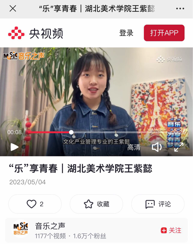 2023年5月4日,值五四青年节之际,中央电视台音乐之声Music Radio栏目携手广大高校青年学子,以“音”为有梦,“乐”享青春为主题,共同抒发青春愿景,追求青春梦想。湖北美术学院艺术人文学院学生王紫懿参与此次五四青年节央台之声活动,发表青春宣言:不忘初心,奋楫笃行。值五四青年节,和音乐之声一起以乐为名,砥砺前行。