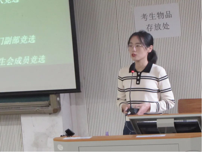本次大会由学生会主席徐善玮主持,主持人简要介绍了会议流程,学生会换届大会正式开始。首先,由辅导员李依雯老师发表讲话,李老师对于参与竞选的学生会成员给予了肯定,希望同学们不要紧张,在台上展现出最真实的自我,老师还表示无论是在生活还是学习中,都希望可以加强师生之间的交流。紧接着,副主席朱书珍对今后大家的工作给予了厚望,希望大家可以好好利用本次演讲的机会,锻炼自己。随后竞选开始,大会上的气氛开始变得热烈而又紧张,参与竞选的同学依次上台演讲,演讲内容丰富精彩,各候选人简单地介绍了自己的优势、工作经验、对于学生会工作的态度以及工作规划,并在演讲完后,从容的回答了自己竞选部门学长和学姐们提出的问题。现场的同学们互相鼓掌激励,使大会的氛围逐渐活跃轻松起来。