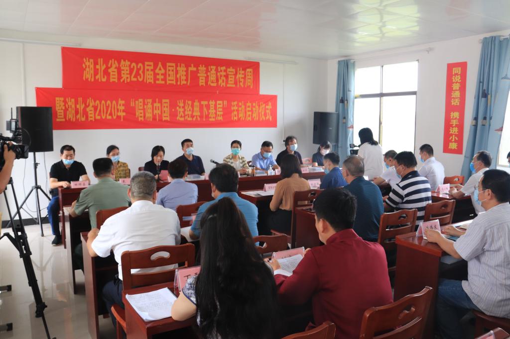 9月14日,湖北省第23届全国推广普通话宣传周暨湖北省2020年“唱诵中国·送经典下基层”活动在黄冈市蕲春县童畈小学正式启动。省教育厅副厅长、一级巡视员黎虹,省语委办主任戴明,武汉音乐学院党委书记陈兴荣、副院长李幼平,省语委成员单位、黄冈市教育局、蕲春县领导出席活动。活动同时通过现场与网络直播同步的方式,在孝昌、巴东、监利、丹江口、随州、江夏等革命老区、民族山区、贫困地区的6所农村学校举行了简短但隆重的启动仪式。