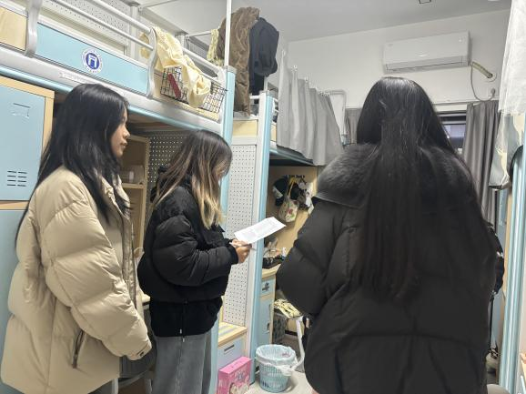 本次检查围绕消防安全隐患排查和宿舍卫生死角整治两个重点方面有序展开。在消防安全检查方面,重点排查宿舍内是否存在违规使用大功率电器、私拉乱接电线、存放易燃易爆物品、占用或堵塞消防通道等问题,全面检查消防设施配备及完好情况,确保疏散通道畅通无阻,切实筑牢宿舍消防安全防线。在环境卫生整治方面,督促和引导学生对宿舍内部及公共区域进行全方位清扫,重点清理阳台、墙角、床底等易被忽视的卫生死角,要求物品摆放规范有序、地面桌面干净整洁、宿舍环境通风良好,全面提升宿舍整体卫生水平。