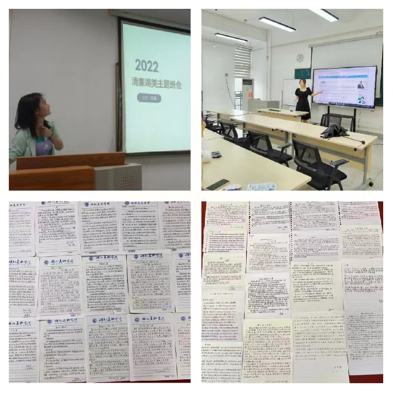 艺术人文学院统筹推进,充分发挥课堂教学主渠道,学理论明道理。同时有效发挥校园文化活动育人功能,通过组织参加喜迎二十大征文比赛、书画作品展、廉洁海报设计大赛、红安红色文化基地教育社会实践等活动,营造崇尚廉洁自律的健康校园文化。结合专业特点,学院推出“清风习语沐人文,廉洁文化沁人心”栏目,并制作宣传展板、微信推文,引导广大师生深入学习贯彻习近平总书记关于党的纪律和规矩重要讲话精神,以系列讲话中所引用的古代典籍为切入点,诵读经典,掷地有声的弘扬廉洁文化。