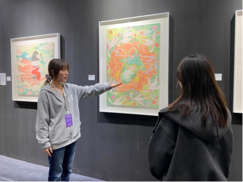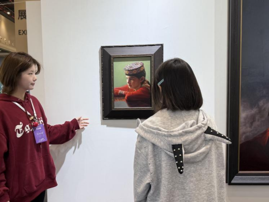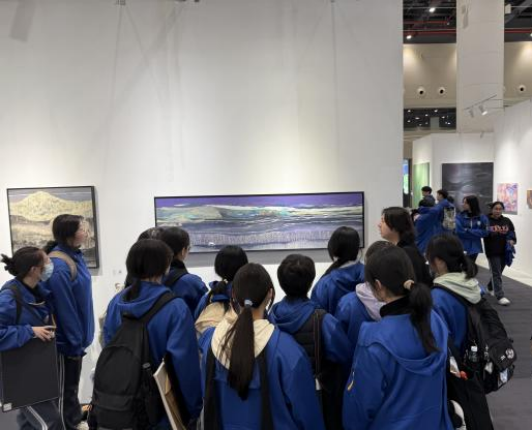 展会期间,艺术人文学院的学子们穿梭于各主题展区,承担起流动讲解与展务支持工作。他们以学术素养为根基,以青春话语为纽带,既能准确解读作品内涵,也生动传递艺术温度。通过走出校园,深入行业实践第一线,同学们不仅深化了对艺术市场的理解,更在真实场景中砥砺专业能力,为个人职业发展路径进行了积极探索。
