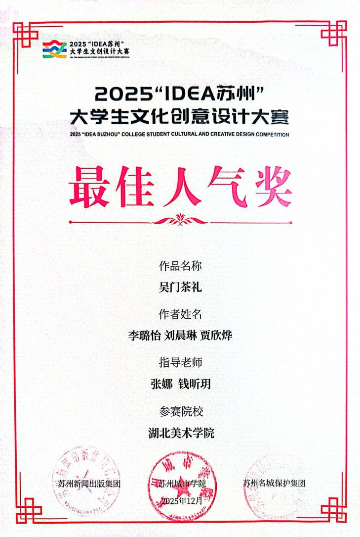 此外,在2025“IDEA苏州”大学生文创设计大赛中,我院艺术设计学系学生团队同样表现亮眼。该赛事由苏州新闻出版集团等单位联合主办,以苏州千年文脉为文化基底,聚焦“产业创新+文化创意”双核发展方向,鼓励大学生融合传统文化与现代科技开展跨专业创新实践。在张娜、钱昕玥老师的指导下,艺术设计学系学生李璐怡、刘晨琳、贾欣烨、祝冬雪团队的文创作品《吴门茶礼》荣获大赛“最佳人气奖”,该作品兼具创意性与互动性,充分展现了青年学子对传统文化的创新理解与当代表达。