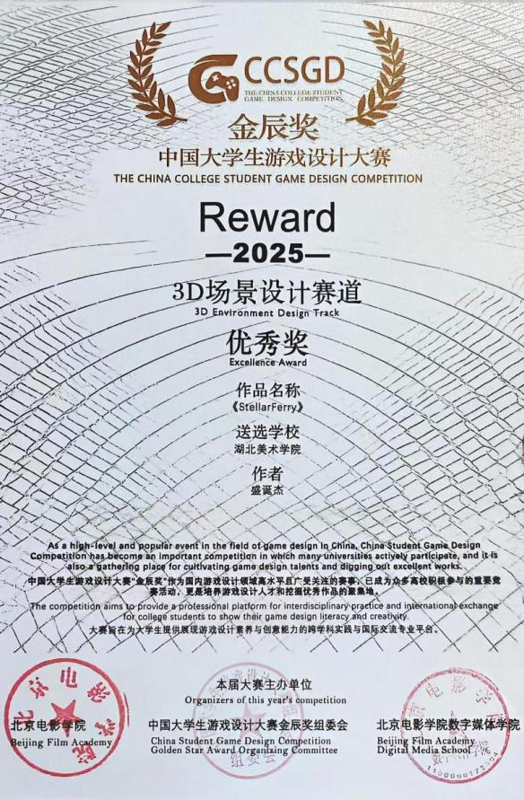 中国大学生游戏设计大赛“金辰奖”是国内大学生游戏设计领域的重要赛事,致力于发掘兼具创意能力与实践素养的青年游戏设计人才,推动“游戏+”领域的创新发展。我院艺术设计学系学生盛诞杰的原创游戏设计作品《StellarFerry》荣获3D场景设计赛道优秀奖。盛诞杰同学在比赛中展现出良好的专业基础与创作能力,反映了艺术设计学系在数字艺术创新领域的育人成效。