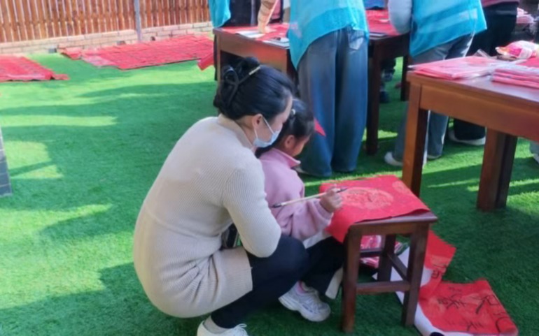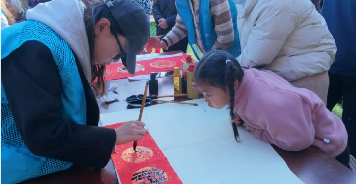 除了为村民送春联,活动现场还专门设置了毛笔字体验区,吸引了小朋友前来参与。在同学们的悉心指导下,孩子们握起毛笔,学习基本笔画,虽然动作略显稚嫩,但神情十分认真。