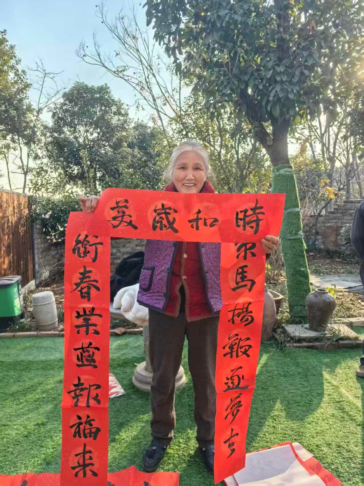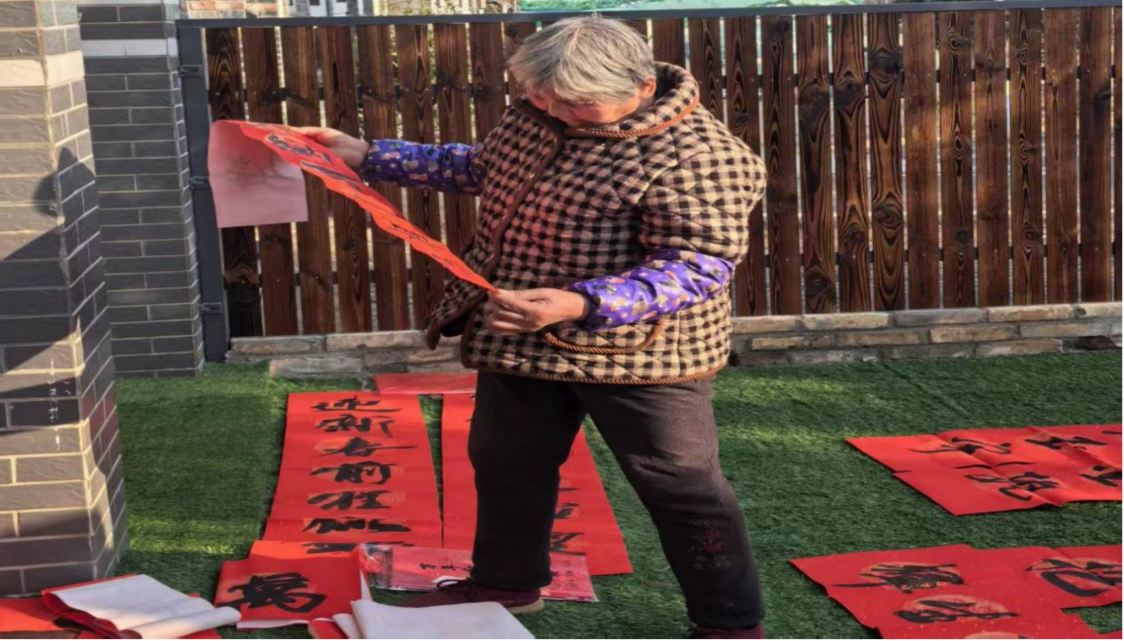 活动当日,老屋穆湾共享学堂内外洋溢着喜庆祥和的气氛。同学们提前布置场地,备齐笔墨纸砚,于现场挥毫创作。一行行工整隽秀的书法,一幅幅寓意吉祥的联句,如“门迎晓日财源广,户纳春风吉庆多”“春至百花香满地,时来万事喜盈门”等,既传承了中华年俗文化,也融入了对乡村发展的美好祝愿。活动吸引了众多村民驻足观赏、有序选取。