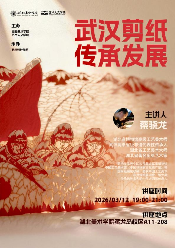 为了传承优秀的非遗文化,拓宽学生的专业视野,提升实践认知能力,湖北美术学院艺术人文学院艺术设计学系特邀湖北省博物馆高级工艺美术师、武汉剪纸省级非遗代表性传承人、湖北省工艺美术大师蔡骁龙于2026年3月12日在A11-208教室举办了一场主题为“武汉剪纸传承发展”的讲座。讲座由艺术设计学系主任张娜主持,相关专业师生到场聆听学习。