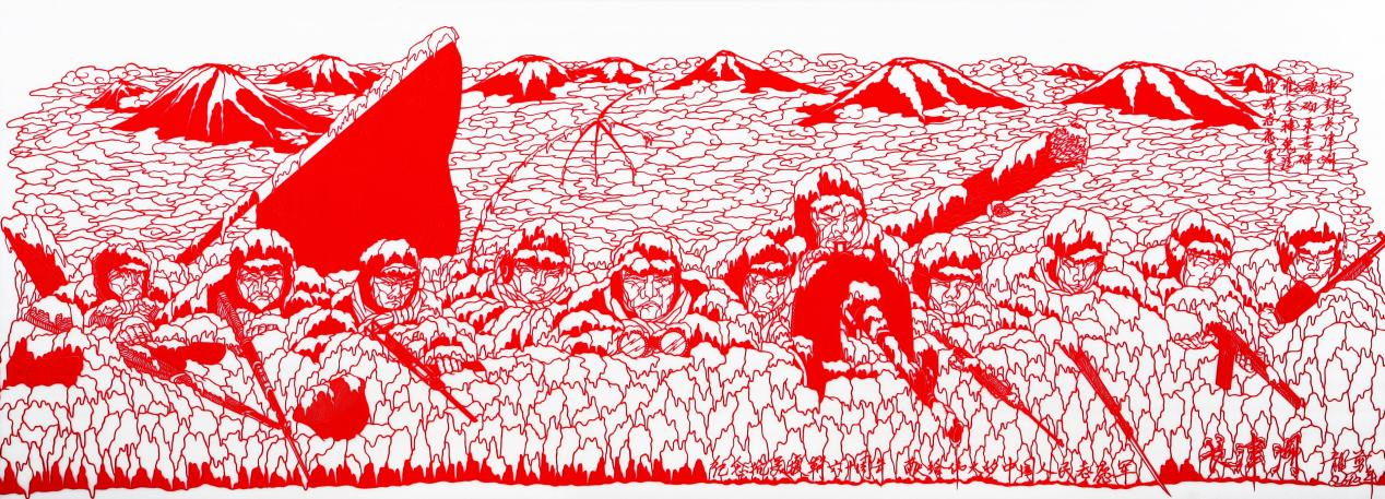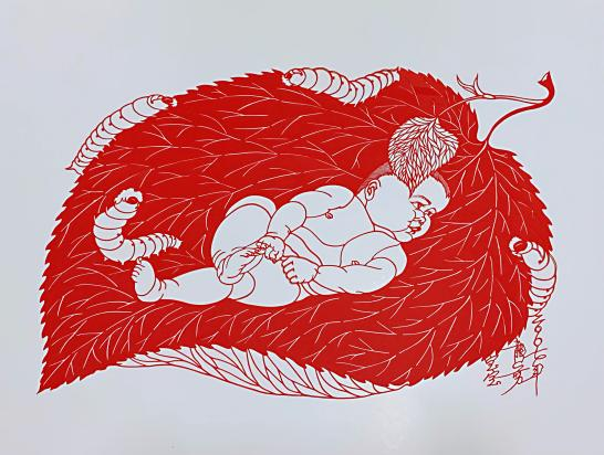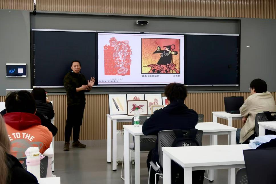 蔡骁龙老师还结合自身数十年的创作实践,分享了个人的创作理念与技艺心得。他展示了脱稿剪纸、连线细纹等传统技艺的创作成果,分享了红色题材创作、民俗题材创新、现实题材表达的创作思路,阐释了传统剪纸技艺在当代创作中的活态应用路径。在互动问答环节,针对在场师生提出的“工业化生产与传统手工技艺传承”的问题,蔡骁龙老师表示,现代化的创作与传播方式为剪纸文化的大众普及提供了新路径,而传统手工技艺的传承,更需要创作者沉下心来深耕打磨,二者共同构成了非遗活态传承的不同维度,深刻的见解让在场师生深受启发。