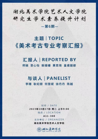 2023年10月17日上午,艺术人文学院研究生学术素养提升计划第六期《美术考古专业考察汇报》在A11-308教室如期举行,此次汇报的同学为艺术人文学院2023级美术考古方向研究生师娟、辜心怡、柴姗姗、黄思琦、皇甫丽娜。艺术人文学院副院长李珊,教师代表耿纪朋、何慧斌、徐丹丹、陈越参加汇报。