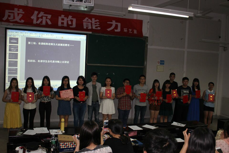 大会在秦运来的开幕词之后正式开始。会上,首先由欧阳老师致辞回顾我系往届学生会各部门的优良成绩,并对往届学生会干部们的辛勤工作给予了充分肯定,并勉励新一届学生会要更加精诚团结,把各项工作提升到心得高度;接着,各个部门播放制作的PPT等视频,送上小礼物欢送往届学生会成员,上一任主席刘畅发言,将现场氛围推向高潮,所有人都潸然泪下。随后,由欧阳老师为上一任学生会干部们颁发了聘书。