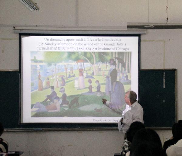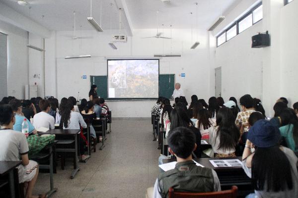 讲座由美术学系陈晶老师主持。在一段风趣幽默的开场白之后, Storey先生先后为同学们大致介绍了几位后印象画派的杰出画家,继而引出讲座的中心人物——梵高。接着他从纽南、巴黎、阿米勒、圣雷米、瓦兹河畔欧韦这五个梵高绘画创作的地域详细地为同学们讲述了他的生平和绘画经历及作品寓意。Storey先生强调梵高是一位十分有个性的画家,梵高之所以进行艺术创作是为了表达他强烈的感受、生命的意义、他对人们的爱、人类与自然科学的关系、以及他的宗教信仰这五个自我情感。梵高的作品通常都着意于真实情感的再现,也就是说,他要表现的是他对事物的感受,而不是他所看到的视觉形象。最后Storey先生就梵高之死的谜团与同学们展开了互动讨论,激发了同学们对研究梵高作品的强烈兴趣。