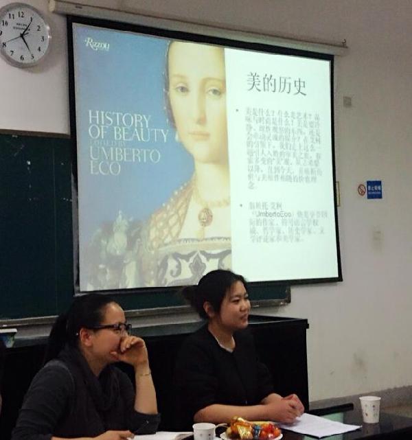 会议伊始,余红梅作为本次会议的主持人向同学们介绍任珊珊老师,接着讲述这次读书会分为三个部分。首先,通过对翁贝托艾柯的《美的历史》的阅读,同学们纷纷提出了自己的疑惑,或是个人的见解,亦或是内心的感受。任珊珊老师也就对于美的认识、美的起源、美术的历史发展这几个部分对《美的历史》进行了简单的表达和交流。