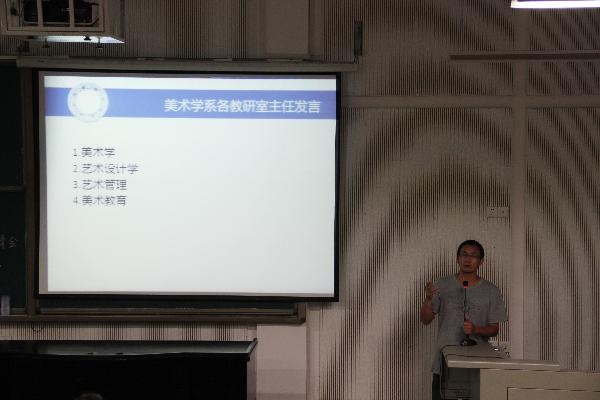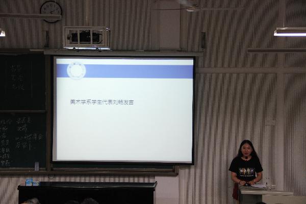 随后,各教研室主任分别上台发言,介绍了各个学科的建设情况和发展前景,并对同学们就业方向也做了说明。美术学教研室主任李珊老师从美术学史论专业重视文献研读、强调知行统一、注重美术史的研究与当前美术的结合、重视跨学科性这四个特色入手让同学们对该专业有更多的了解,还从该专业的就业方向来鼓励同学们,希望每一位同学珍惜四年的大学时光,学有所成。艺术设计专业的肖清风老师、艺术管理的石秀芳老师以及美术教育的何沙敏老师也陆续发言,在详细介绍本专业研究方向、学习内容基础上,激发大家的学习热情,刻苦锻炼、不负自我。