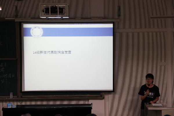 陈美玲书记对全体新生提出了希望,要求大家勇于发扬拼搏奋斗精神,让大学四年在正确的规划下努力向前,脚踏实地的学习,勤于奉献,用自己的青春与智慧书写自己的大学生活。教师代表发言后,学生代表刘畅就自己的亲身经历向14级学弟学妹谈了几点自己的感受,新生代表赵悦含随后发言,激情的演讲表达出对新生活的向往与憧憬。