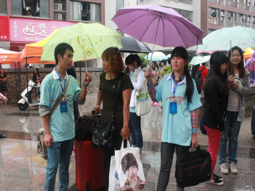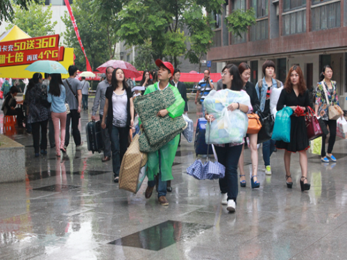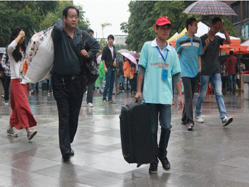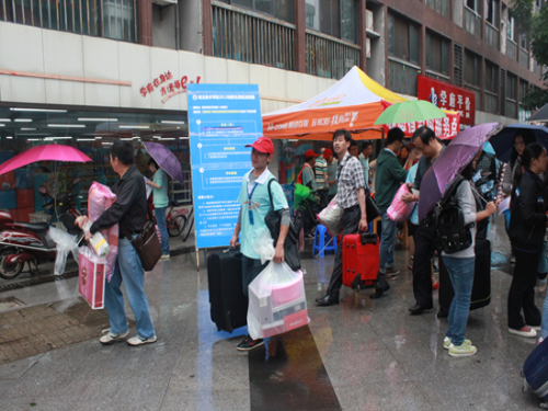 9月6号早上七点,志愿者就到达迎新点集合。纵使下着雨,依然阻挡不了志愿者为新生服务的热情。他们各自打伞,站到指定点,等待着新生的到来。看到背负重重行囊的新生同学,志愿者不怕苦不怕累,雨伞也撇在一旁,帮忙将行李搬运到寝室。女志愿者也不例外。在注册处的志愿者一刻不闲的为新生和家长详细讲解报到程序,一一回答他们对学习或生活等方面的疑问,十分耐心。还有的志愿者主动要求为新生带路、嘱咐他们出门要锁门等一些生活小事,一路有说有笑,刚刚相识的学弟学妹与学长学姐仿佛认识了许久,寒风细雨中家的温暖弥漫开来。