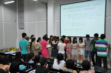 大会分为五个环节。首先是辅导员赖老师发言,她强调大家应扮演好两种角色,一是学生,二是子女。做学生,最重要的是好好学习,但前提是讲求诚信。随着期末考试的临近,赖老师希望同学们好好复习,诚信考试,考出好成绩。父亲节刚刚过去,老师不忘提醒我们感恩父母,并同我们一起分享了一篇名为《不能等待》的文章和一段感人肺腑的视频,形象的告诉大家暑期回家对父母的感恩要体现在言行中。接下来是学生会副主席蔡照总结这一年丰富多彩的学生活动。他首先感谢所有同学的积极参与以及系书记和辅导员对活动的与指导。接着,他向大家展示了一些活动的场面,有合唱比赛、篮球赛、足球赛、团日活动、创业设计大赛,还有各班的班级活动和各社团的活动。一张张照片、一段段视频,无论当时成绩的好与坏,现在都成了美好的回忆。学生活动介绍完后,生活部部长朱冬宁向大家展示优秀寝室。整洁的桌面与床铺,温馨的装饰,几个人其乐融融的小屋……一张张幻灯片将大会的气氛推向高潮。随后是大会重要的一环节——对优秀表彰。三好学生、优秀学生干部、先进班集体、院奖学金、国家励志奖学金和九十周年优秀学生演员及优秀工作者……一年的辛苦与努力,在这一刻绽放出最美丽的笑容。最后,路书记以“不断进取,营造和谐”为主题做总结。她高兴地看到大家的成长和所取得的成绩,并希望大家更加努力学习,积极进取,把个人能力和社会需要相结合,做一个诚实、正直、健康、快乐的大学生。