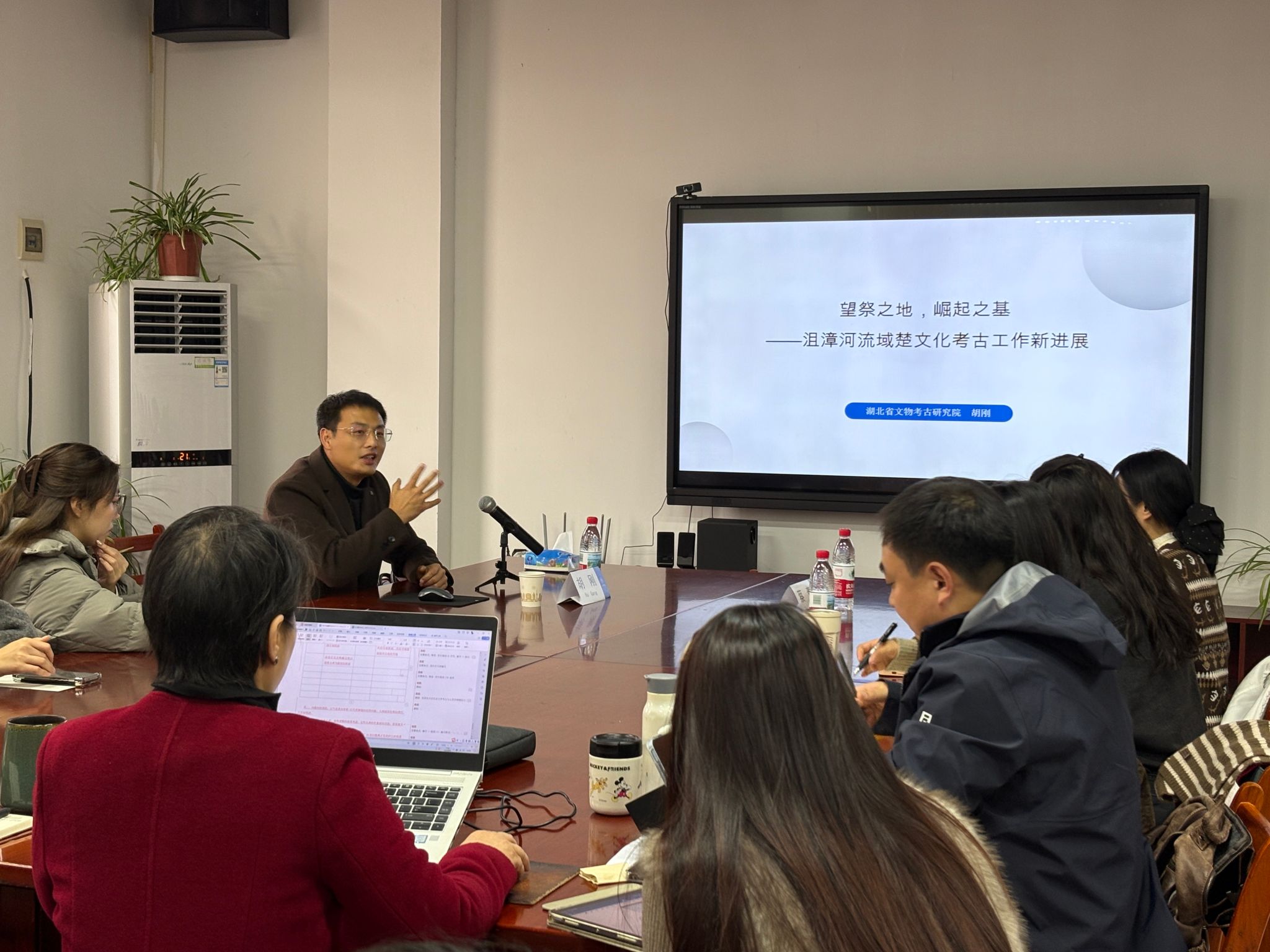 12月12日,湖北省文物考古研究院研究馆员、商周考古部主任胡刚聚焦楚文化考古与研究生学术成长开设学术讲座“望祭之地,崛起之基—— 近百年沮漳河流域楚文化考古工作新进展”。胡刚研究员结合自身主持或参与的多项重大考古项目,从沮漳河流域的地理与文化价值切入,系统回顾近百年楚文化考古历程,重点分享万福垴遗址、磨盘山楚城等近年新发现,梳理楚中心聚落的演变轨迹,揭示楚城营建的特征,为师生搭建起考古发现与艺术研究的沟通桥梁。
