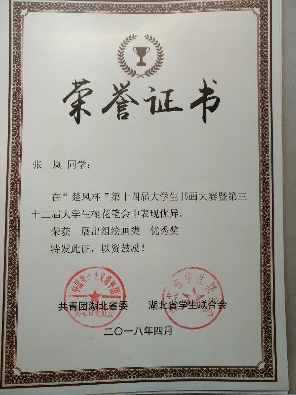 此次比赛由共青团湖北省委、湖北省学生联合会、共青团武汉大学委员会武汉大学学生社团指导中心,武汉大学书画协会共同举办。美术学系兰亭书法协会负责人陈方亮等同学组织社员共投稿有20余幅作品,其中包括软笔,硬笔,绘画和篆刻。绘画展览组中,张岚、黄炜钦同学获优秀奖;硬笔篆刻创作组中,肖月同学获三等奖。