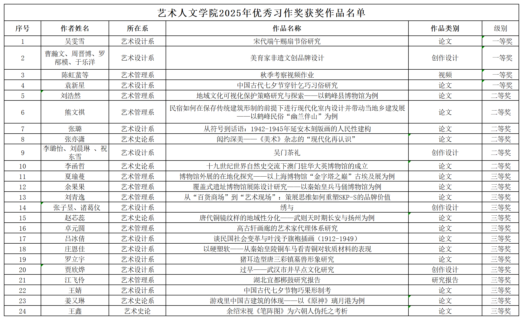 根据学校相关规定及工作通知的要求,艺术人文学院11月28日上午召开2025年度本科生优秀习作奖评审小组工作会议,评选出本年度本科生优秀习作一等奖4件、二等奖6件、三等奖14件。现将评审结果公示如下: