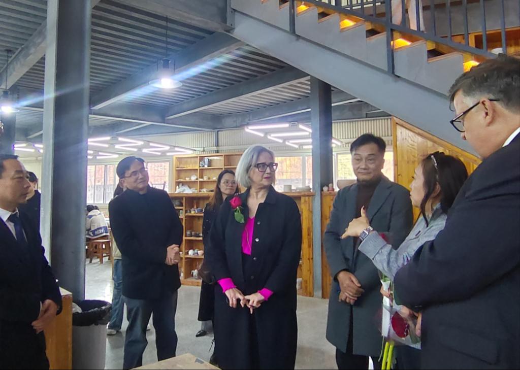 之后,美院的老师们邀请英方嘉宾来到手工艺学院陶瓷实验室体验中国陶瓷文化的独特审美内涵,了解同学们的创作过程,并在此间就传统文化对外传播进行学术研讨。与此同时,老师带领曼彻斯特城市大学的嘉宾们去看土窑烤炉时,他们对陶瓷烧制万千变化的未知之美啧啧称奇、大为欣赏。