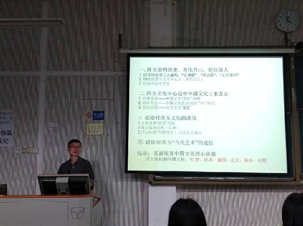 (通讯员:吴若彤、罗芝颖)2018年5月3日晚上19点,美术学系邀请浙江大学人文学院教授兼中国美术学院兼课教授黄河清来我校开展了关于“破除西方中心论,高扬中国文化自信”的主题讲座。